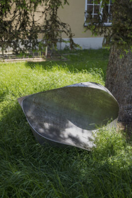 Object: This abstract stainless steel sculpture is arranged in a vertical composition. It is constructed using three equally convex planes, the edges of which – characterized by uneven, corrugated lines – meet at the base and on top, giving the stereometric shape a dynamic character. The spiral form, which brings to mind a ship’s screw propeller, gives the impression of constant movement. The surface of the work is smooth, with a mirror texture. The sculpture was acquired by the National Museum in Gdańsk directly from the artist on 28 November 1974. Since then, Sails has formed part of the open-air sculpture gallery in the Oliwa Park. Owing to the damage suffered by the statue when two trees fell on it, in 2016 it was provisionally dismantled and moved to the courtyard of the Abbots’ Palace (seat of the NMG’s Modern Art Department). The work is not signed.