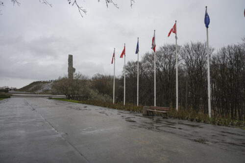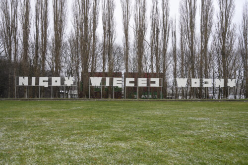 Adam Haupt also envisaged the construction of a museum pavilion in his urban planning project, but this idea was not realised. However, at the foot of the monument, on a stone platform, seven candles were created in the form of metal cylinders, symbolising the seven days of Westerplatte’s defence. Another addition to the memorial is the inscription ‘No more war’, which is located on the mound’s perron. The inscription is placed on a vertical grid. Mounted on it were metal-cut letters about 1.5–2 metres high, forming a slogan about 50–60 metres long.